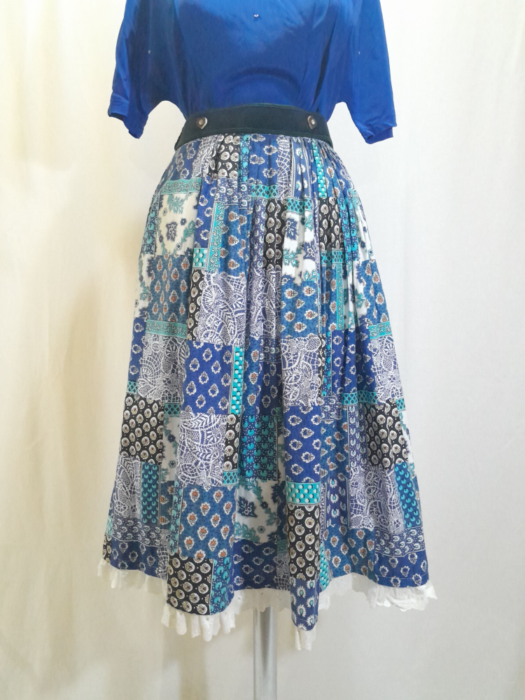 Fusta vintage din bumbac cu talie elastica marcata, ornată cu o bordură din dantelă albă brodată la poale, are captuseala si un buzunar, se inchide cu fermoar lateral , in conditie excelenta , potrivita marimii M/L. Cureaua ii apartine.