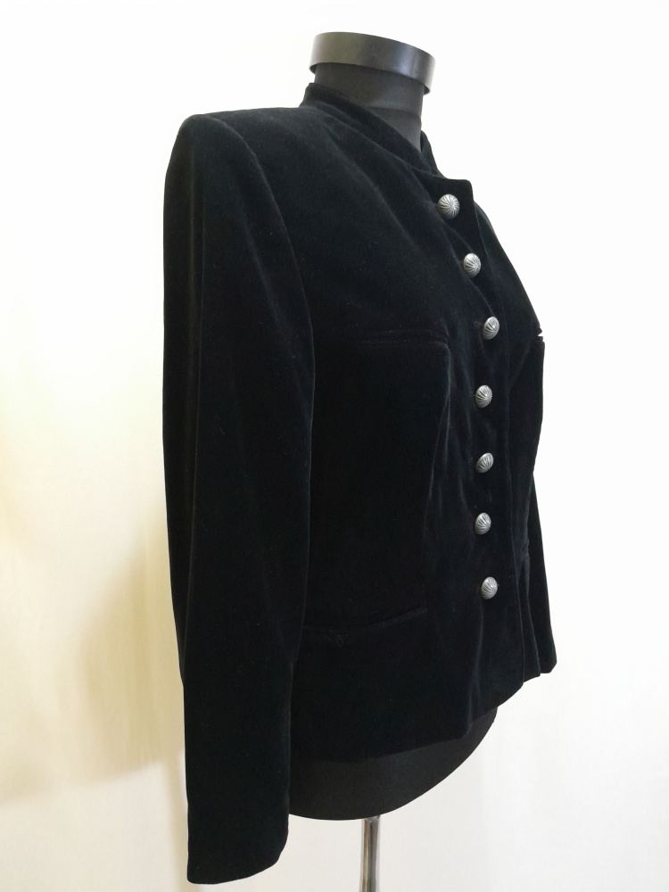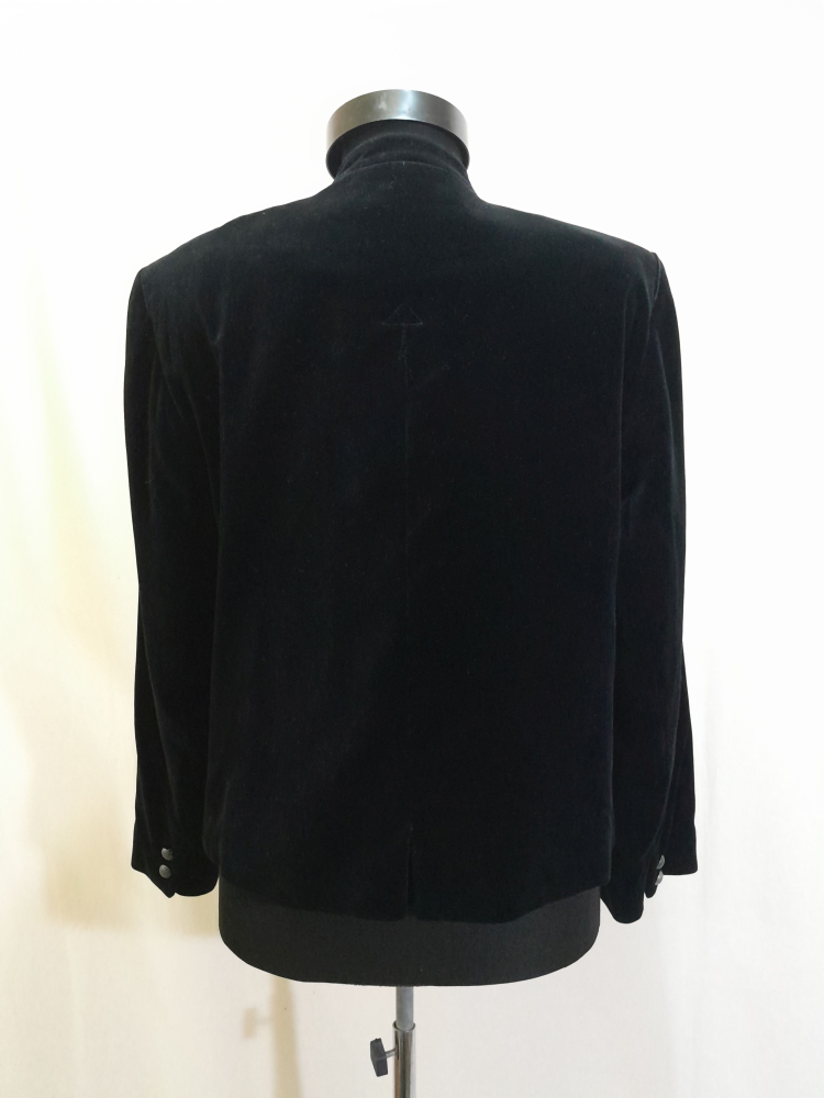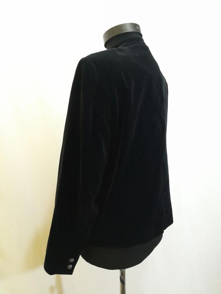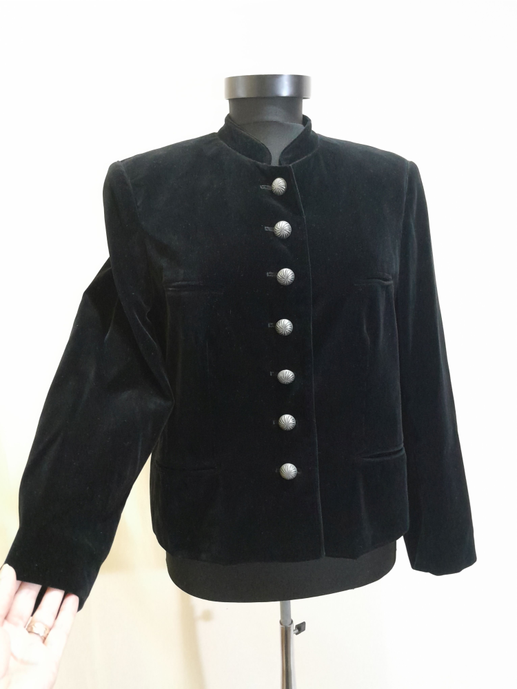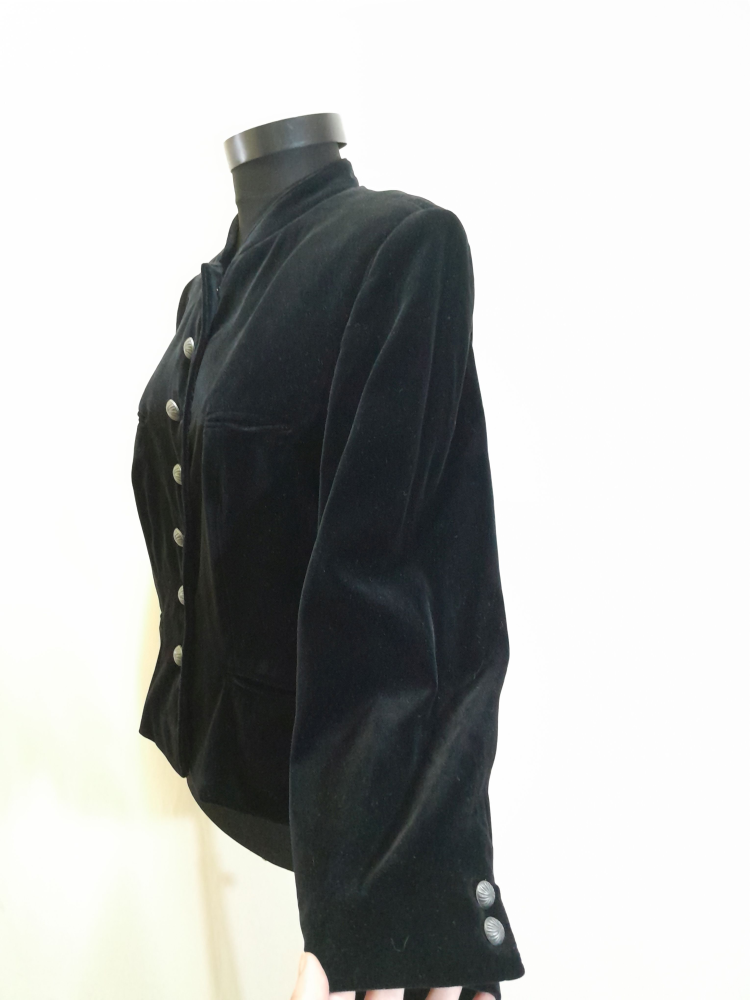 Sacou vintage negru tip tunica, din catifea de bumbac, are buzunare, este căptușit, se închide cu nasturi metalici, în condiție impecabilă, mărimea 40 pe eticheta.