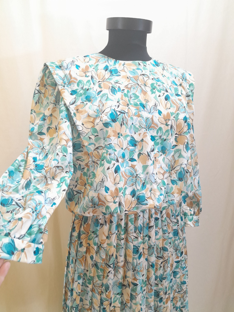 Rochie vintage anii 80 cu imprimeu floral tip pictură , are talie elastica, pliseuri și maneci bufante 3/4, din poliester , este căptușita , se închide cu nasturi la spate , în condiție excelentă, potrivita marimii M/L.