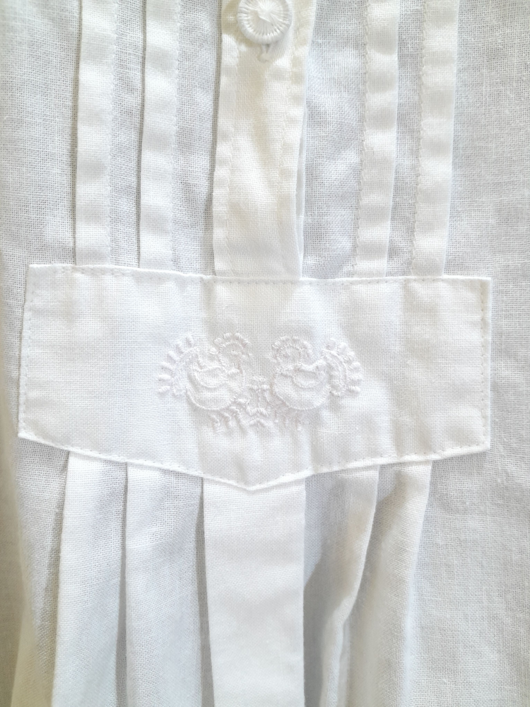 Cămașă vintage albă din bumbac cu broderie , croi lejer și guler tip tunică , are pliseuri în față și închidere parțială cu nasturi , în condiție impecabilă , potrivită mărimii L/XL .