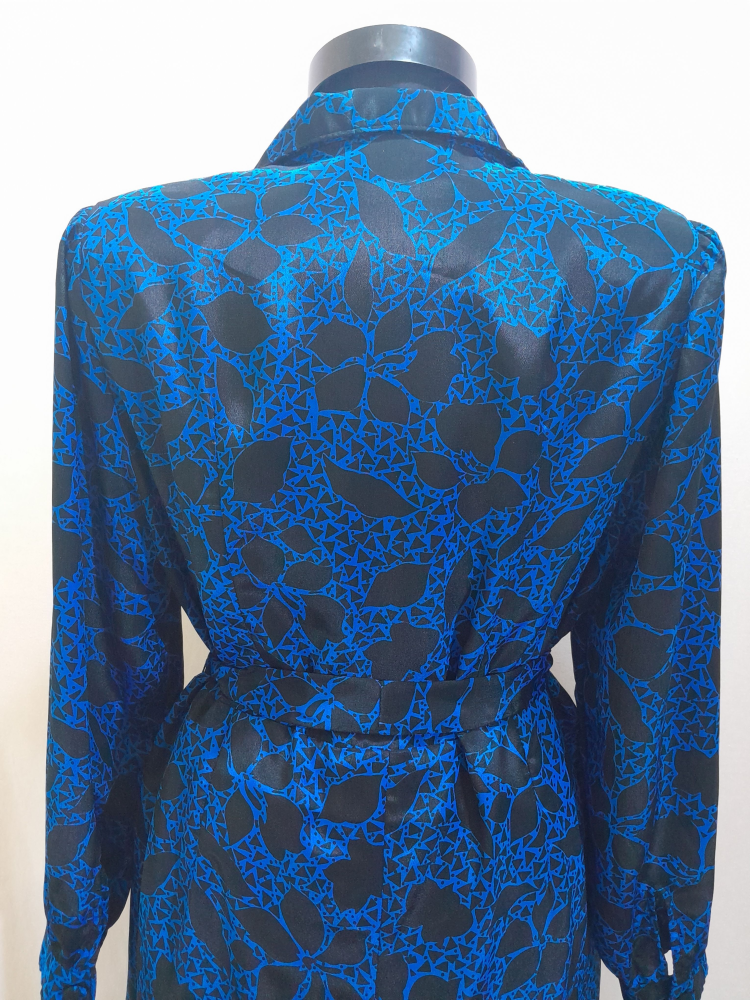 Rochie vintage tip cămașă anii 80 cu imprimeu floral abstract , realizată în atelier, se închide cu nasturi îmbrăcați până în talie, are cordon propriu și fermoar lateral, din poliester , este căptușita , în condiție impecabilă, potrivita marimii M/L.