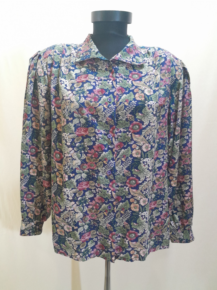 Cămașă vintage Peter Hahn anii 80 din mătase naturală bleumarin cu imprimeu floral colorat