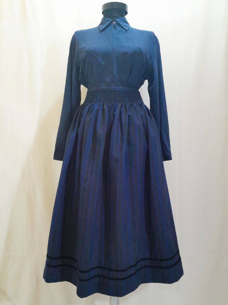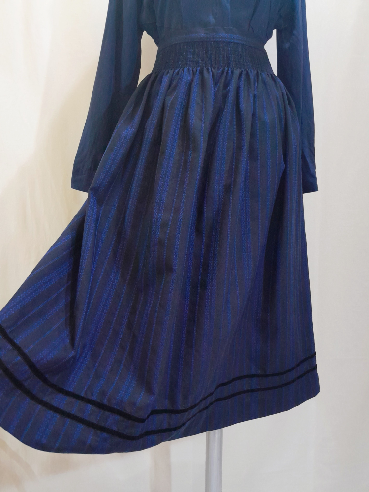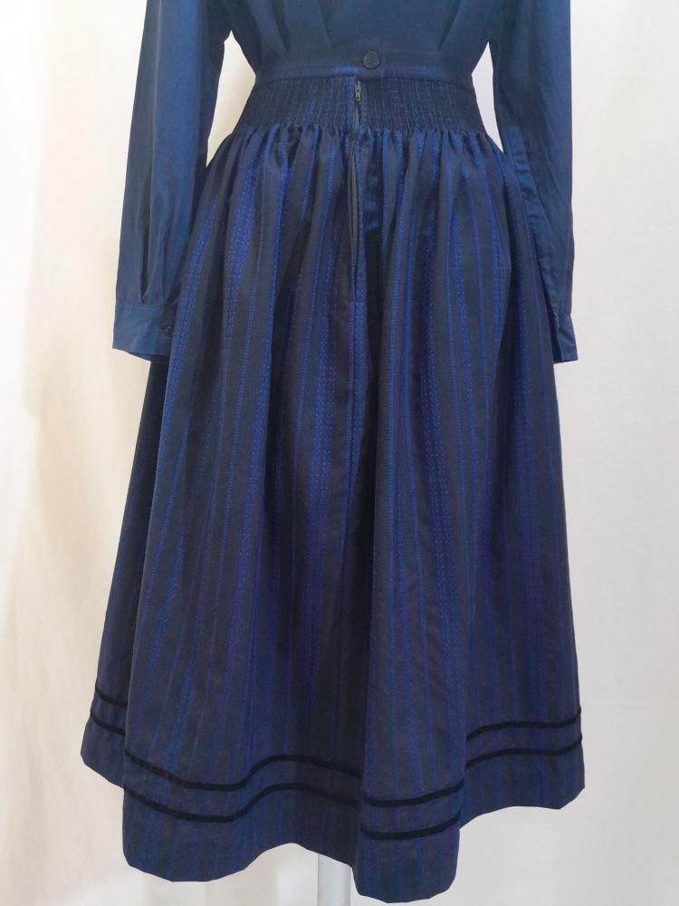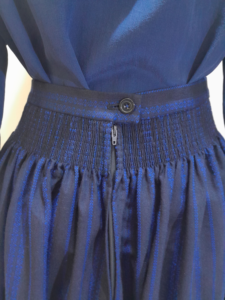 Fusta vintage midi din lână pură virgină fină cu talie înaltă, marcata prin pliuri mărunte, croi în clos amplu , este captusita, nu are buzunare , decorată cu inserții din catifea neagră la poale, se inchide cu fermoar la spate, in condiție impecabila , potrivită mărimii M .