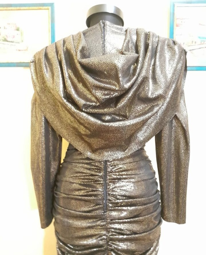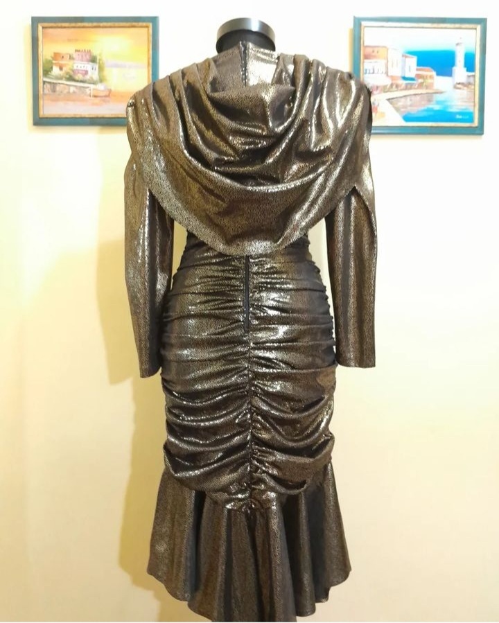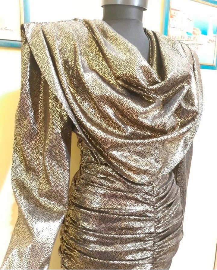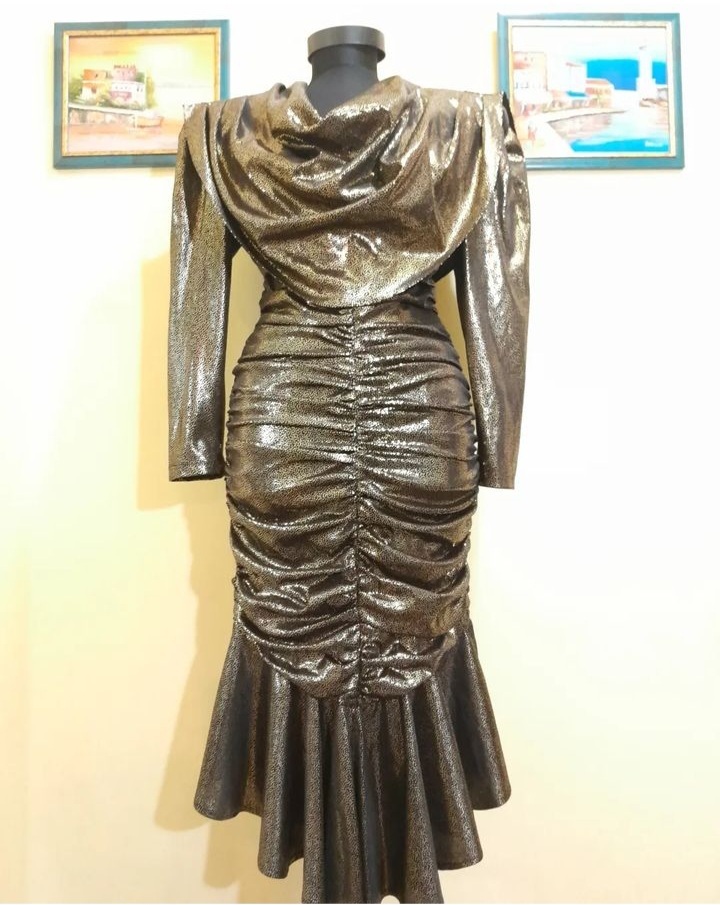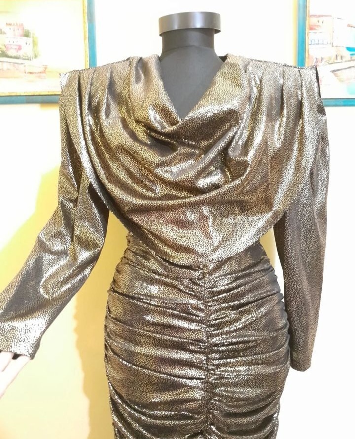Rochie vintage midi de seară mulată pe corp , cu mâneci lungi și detalii încrețite , decolteu drapat , umerii accentuați, se inchide cu fermoar la spate , tivul este evazat, este căptușită, în condiție impecabilă, mărimea 40 pe etichetă .