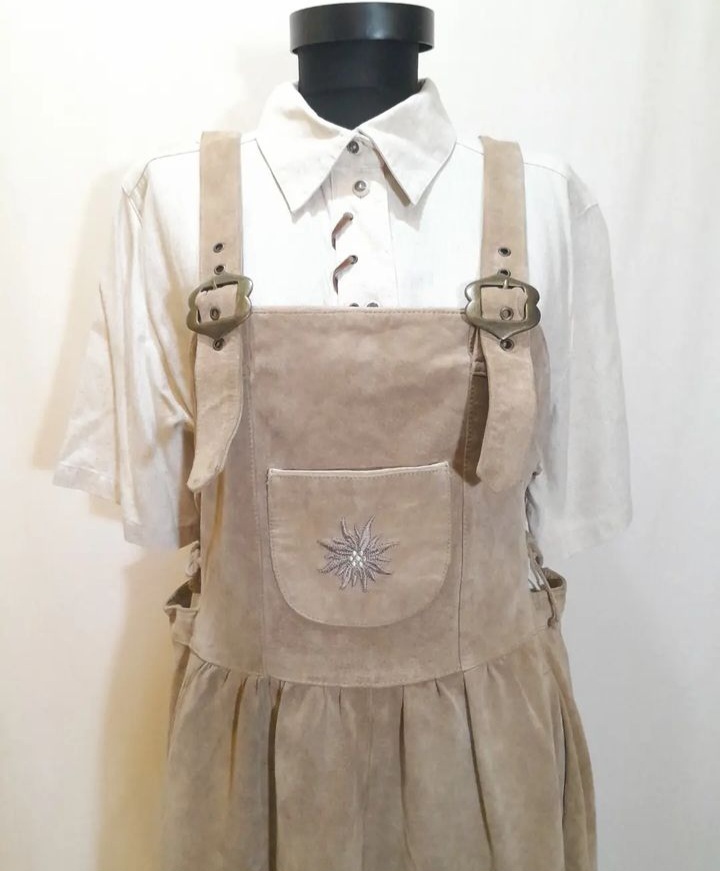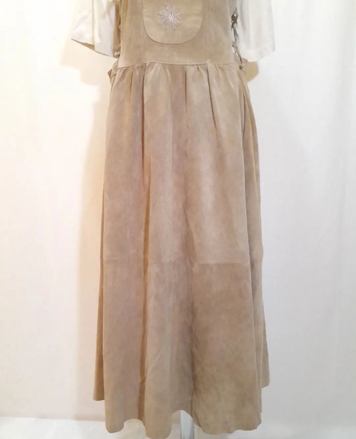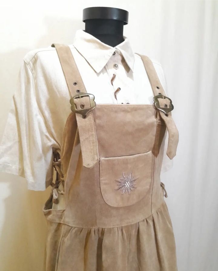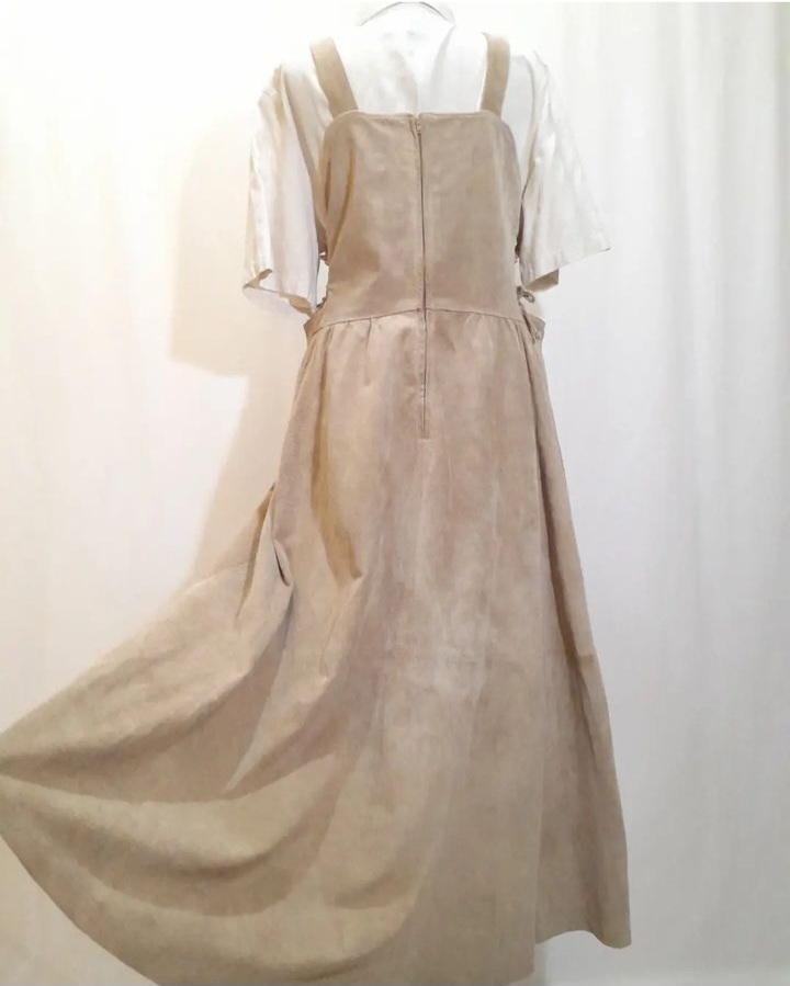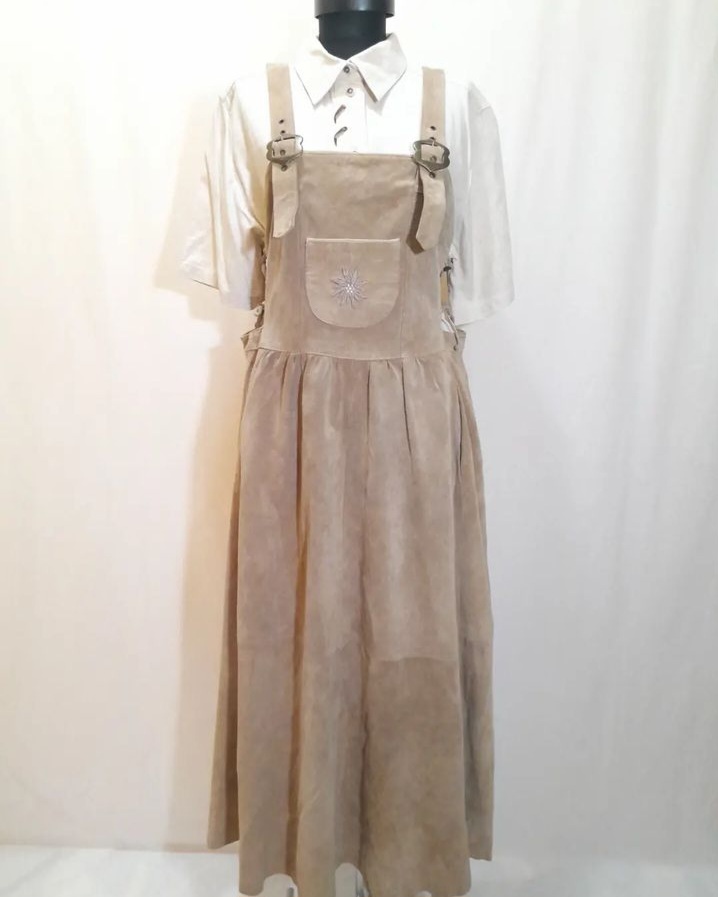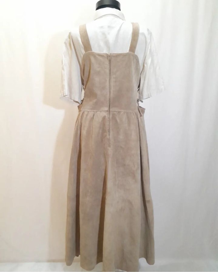 Sarafan midi din piele naturală întoarsă, este căptușit , are buzunare , închidere cu fermoar la spate și șnur în lateral care permite ajustarea pe corp , este în condiție impecabilă, mărimea 44/46 . Cămașa nu îi aparține.