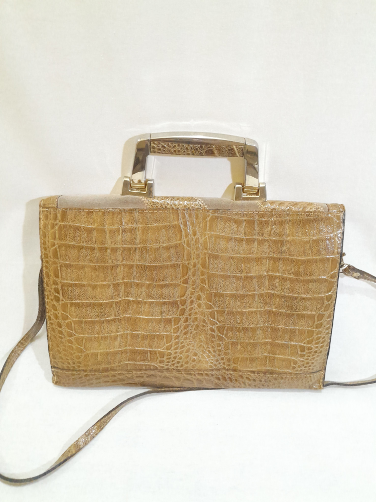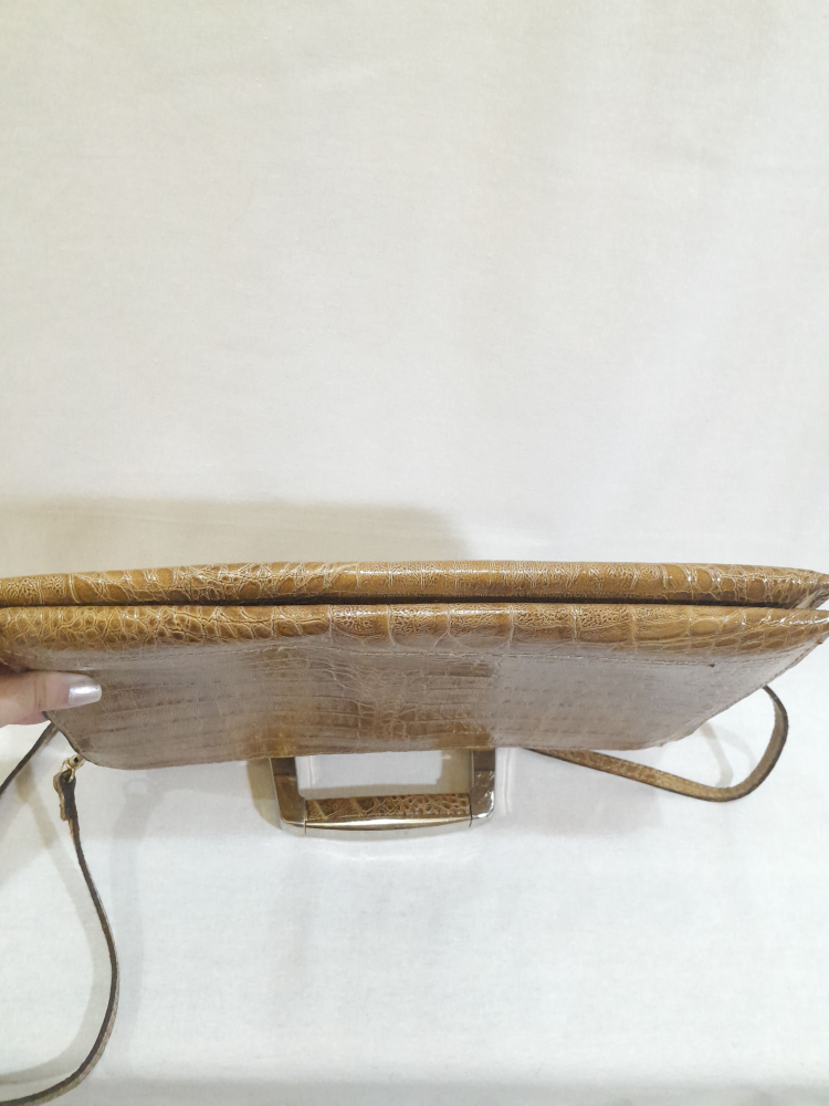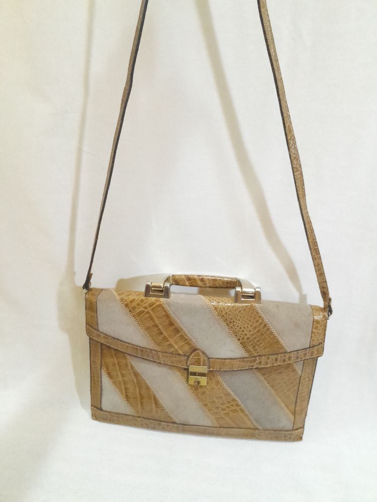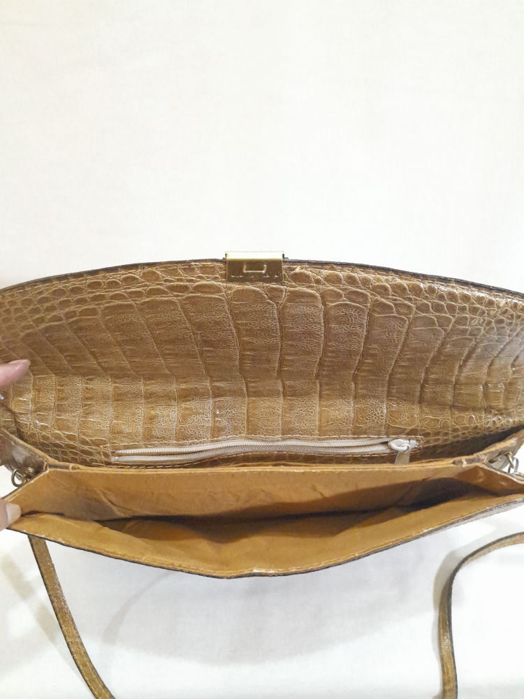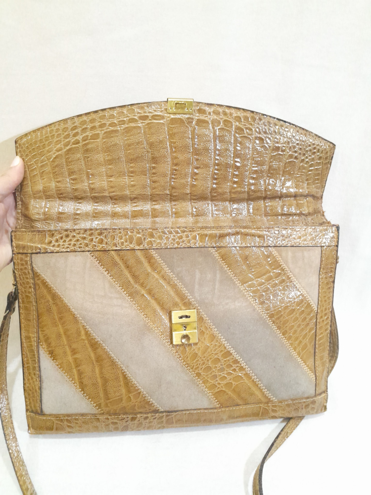 Geantă vintage din piele naturală , are două compartimente, un mâner rigid din metal și piele, curea de umăr detașabilă , feronerie aurie prezintă două pete mici, insesizabile (ultimele foto).