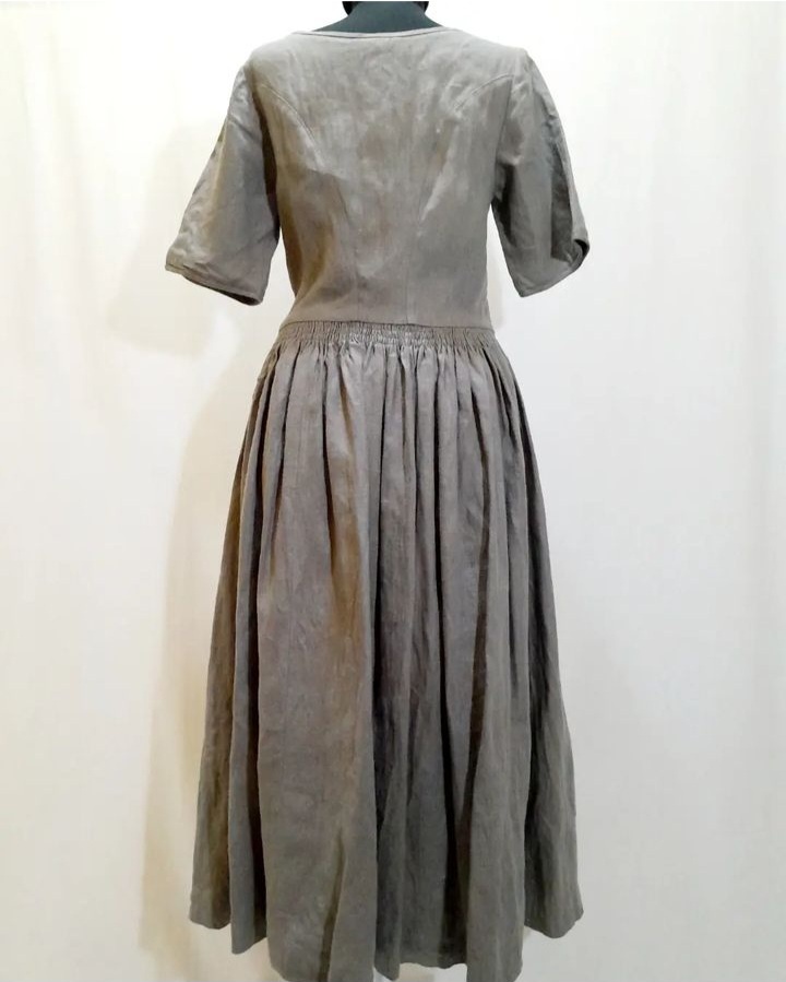 Rochie vintage din in cu corsaj și croi în cloș gri inchis