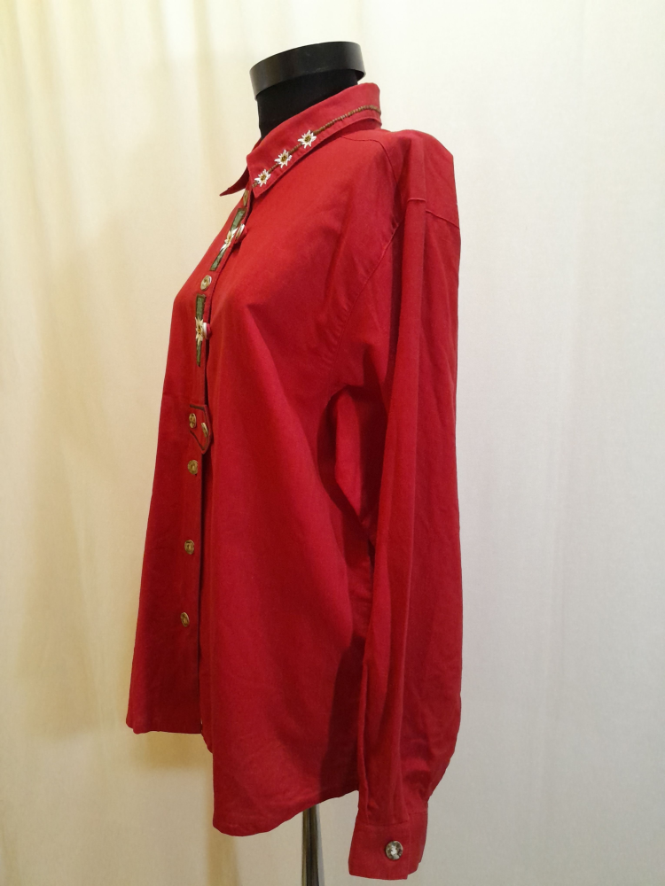 Cămașă vintage rosie cu broderie floare de colt, din in si bumbac , croi lejer, potrivita marimii L/XL, in condiție excelenta .
