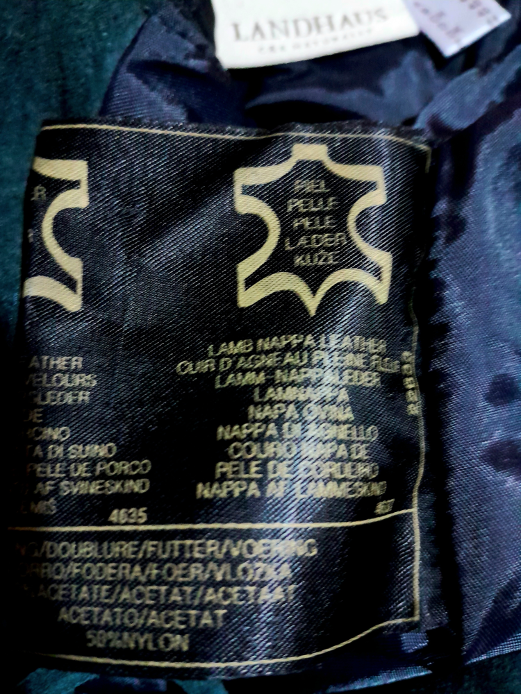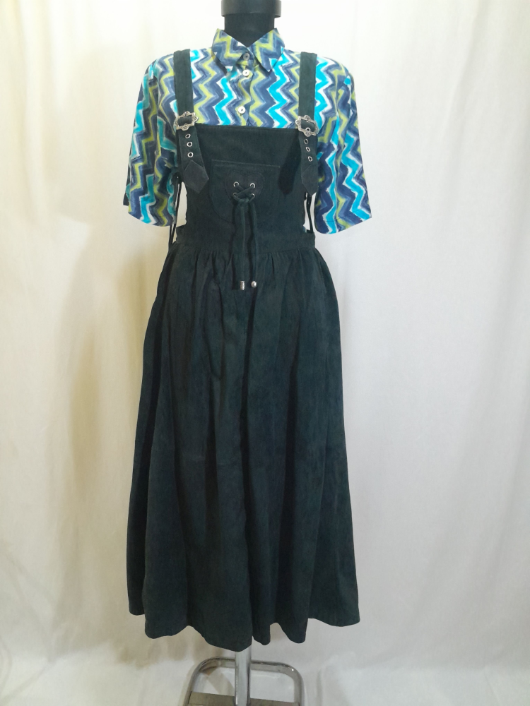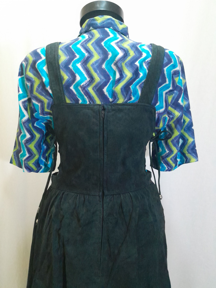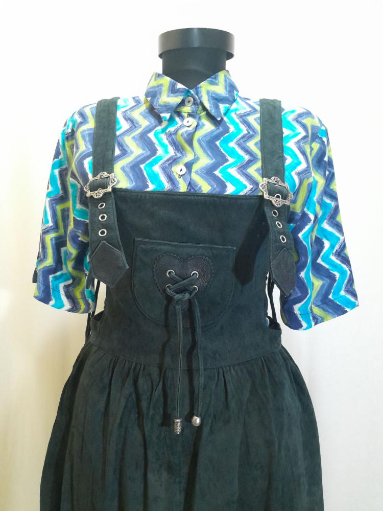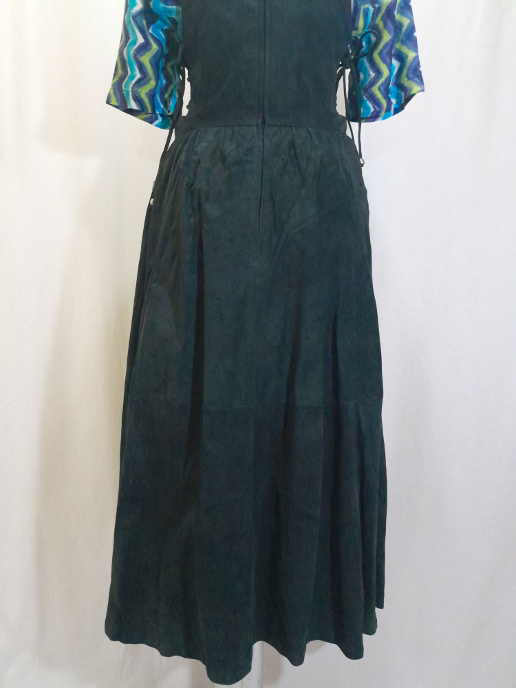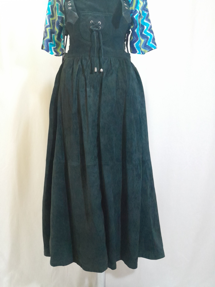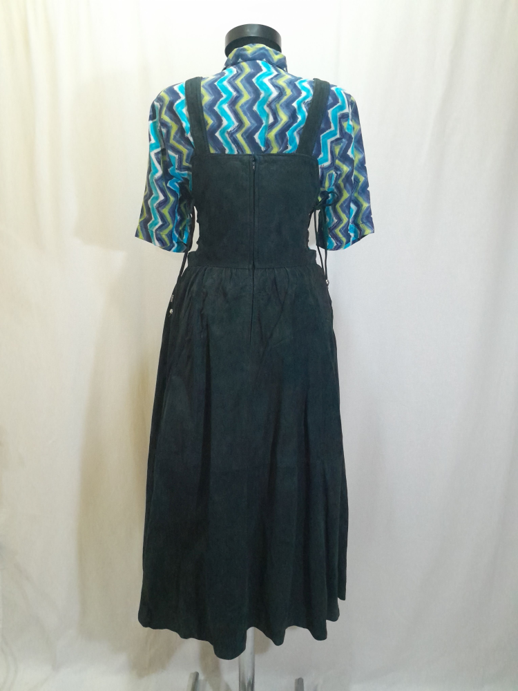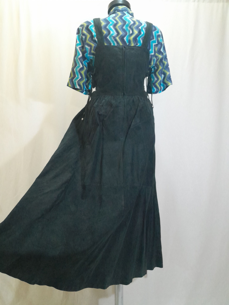 Sarafan din piele naturală întoarsă Nappa , are talie înalta, croi în cloș, prevăzută cu bretele ajustabile prin cataramele metalice, are căptușeala si buzunare , se închide cu fermoar la spate și șnur în lateral, este în condiție excelenta , mărimea 40 pe eticheta . Cămașa nu îi aparține.